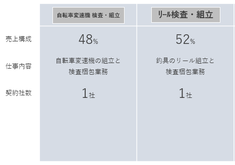 | 事業内容 | 自転車変速機組立事業 釣具リール組立事業 設備・治具制作事業 |